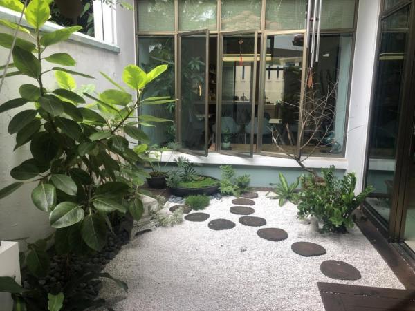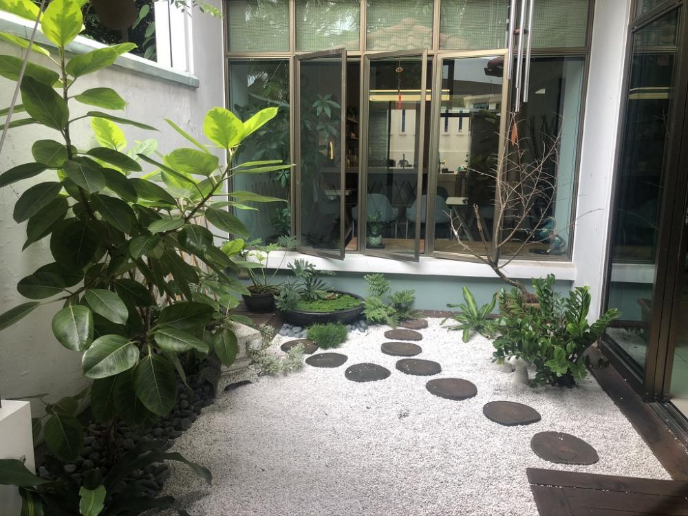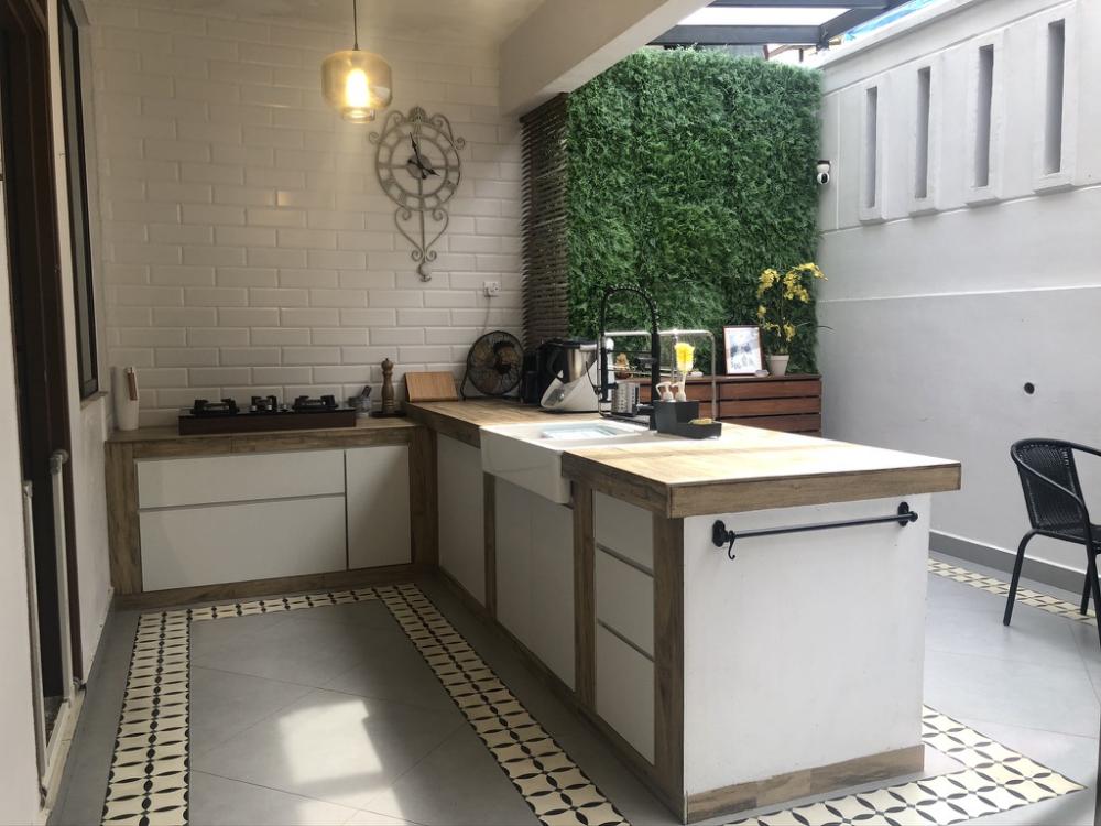 Wet kitchen full extended renovation with iron + glass shelter and built in counter top