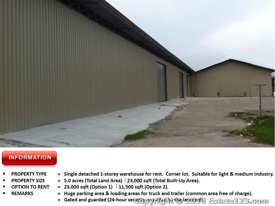 1. Single detached single storey warehouse with column free space. Ideally suitable for warehousing (light manaufacturing can be considered).