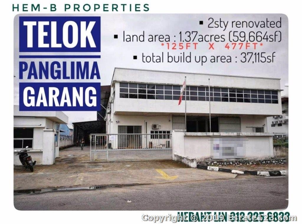 1.5-STOREY BUNGALOW FACTORY @ KAWASAN PERINDUSTRIAN TELOK OANGLIMA GARANG KLANG -LAND AREA 1.4 ACRES ( 61,113SF ) -BUILD-UP AREA 32,567SF -1 FIRST FLOOR OFFICE AREA 4,492SF + MEETING ROOM 543SF -POWER SUPPLY 3 PHASE 1,000AMP -FACTORY / WAREHOUSE CEILING HEIGHT 10 METERS -VERY GOOD LOCATION NEAR HIGHWAY EASY ACCESS -BELOW MARKET PRICE -MORE DETAIL PLEASE CONTACT HEDANT LIN 012-325 6833 REN 01690 THANK YOU
