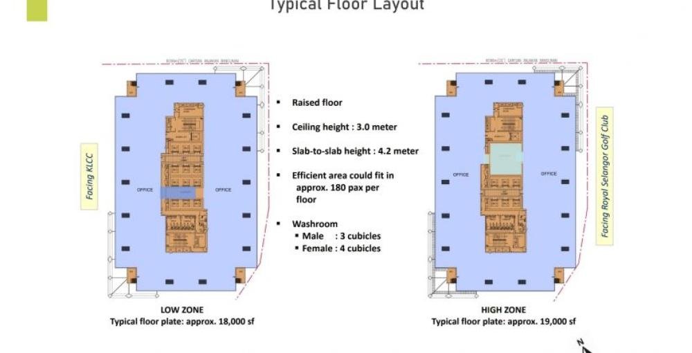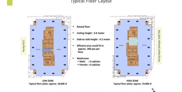 40-STOREY PREMIUM GRADE CORPORATE OFFICE TOWER TO LET: Menara 1, Plaza Conlay features a 40-storey MSC compliance office for rent, with a total lettable area of 610,000 sqft